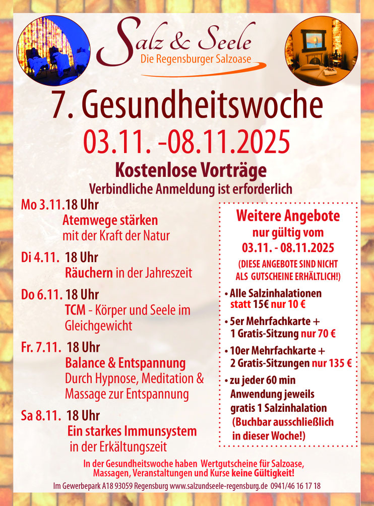 Jede Lesung, sowie jede Atemstunde, Entspannungsstunde oder das Gehirntraining "Geistig fit bleiben" ist eine einstündige Veranstaltung in unserer Salzoase.
