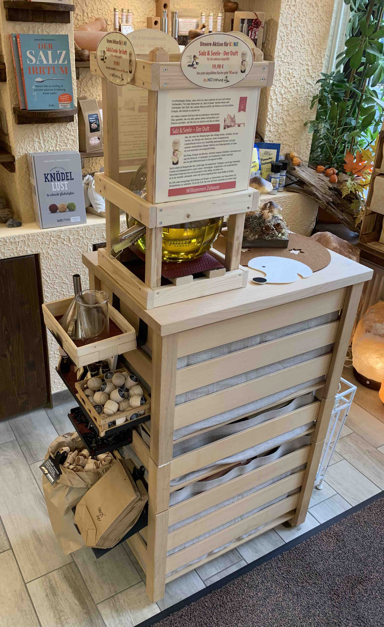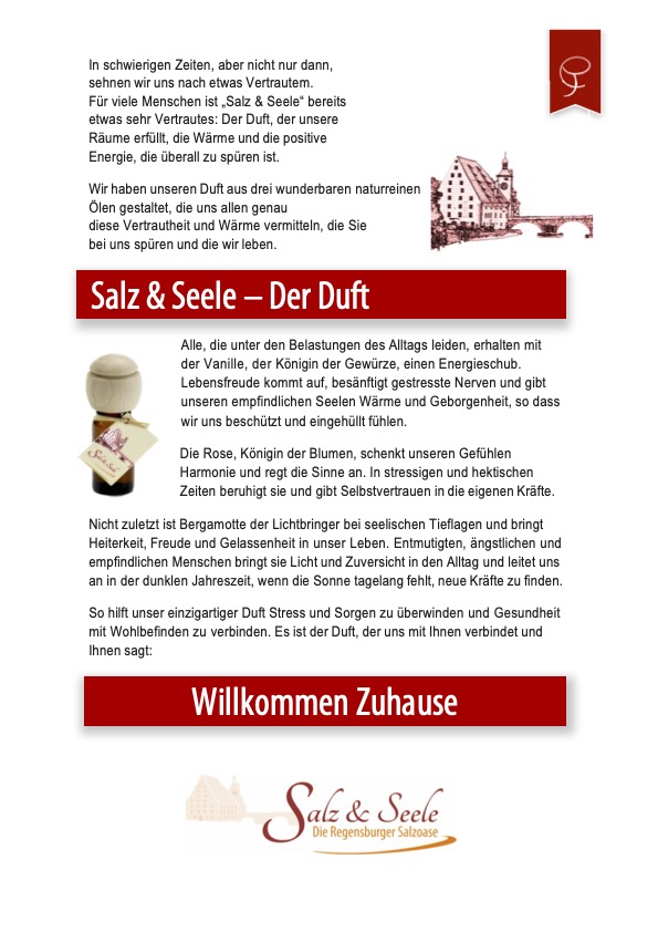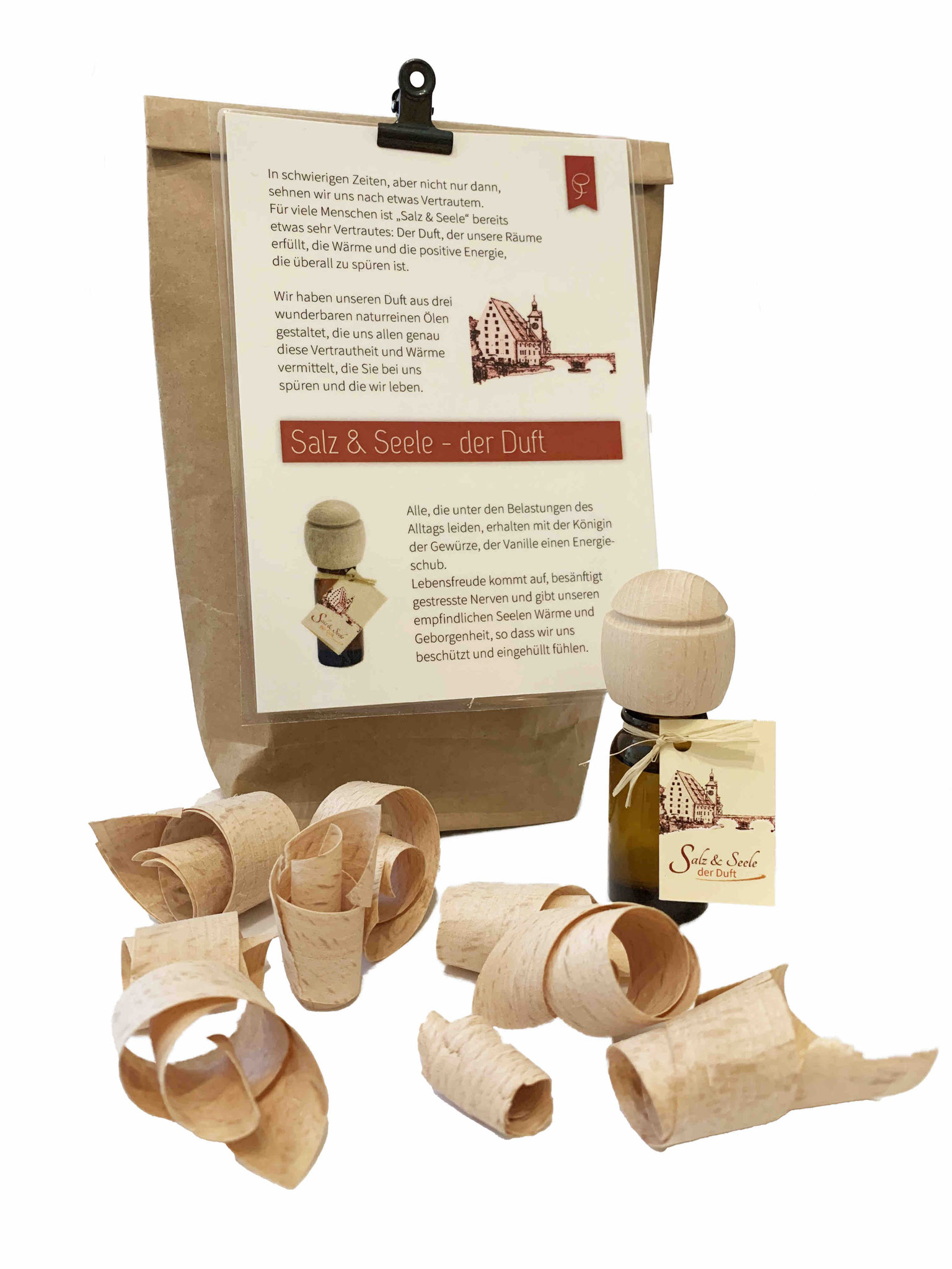 So erhalten Sie zu jeder direkt abgefüllten Flasche einen ansprechenden kleinen Papierbeutel, in dem sich Buchenspäne befinden, die Sie auf einen Teller legen können und mit dem Duft beträufeln können. Außerdem ist vorne noch eine kleine Geschichte zu "Salz & Seele - Der Duft" angeheftet. So erwerben Sie also nicht nur einen wunderbaren Duft, sondern auch ein liebenswertes kleines Geschenk, das sicher gerade jetzt in dieser Zeit ein bisschen die Seele erwärmt.